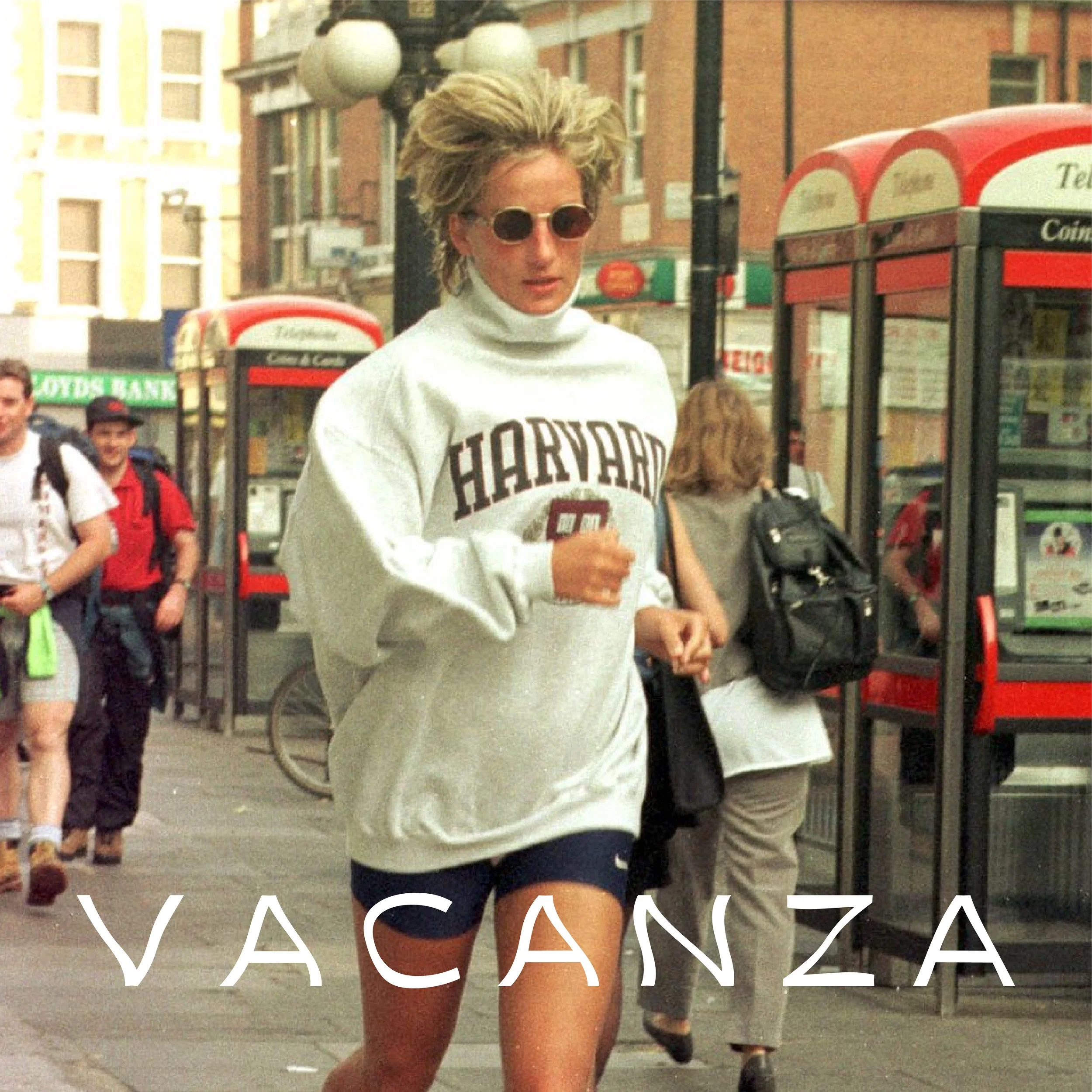 Vacanza is inspired by 90s sports style, and Princess Diana's famous Harvard sweatshirt and biker shorts look.